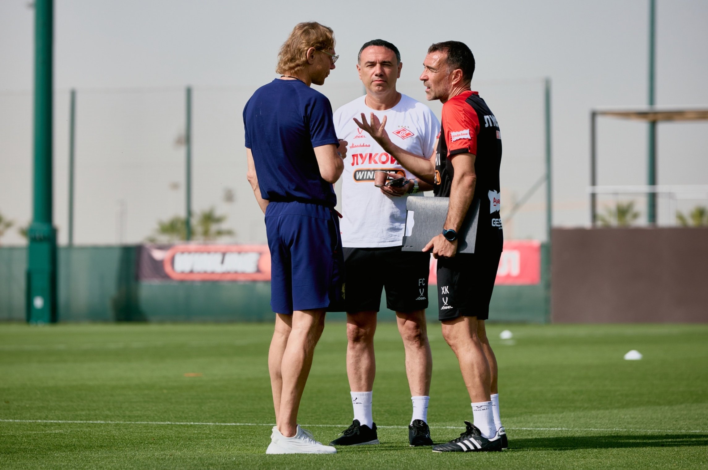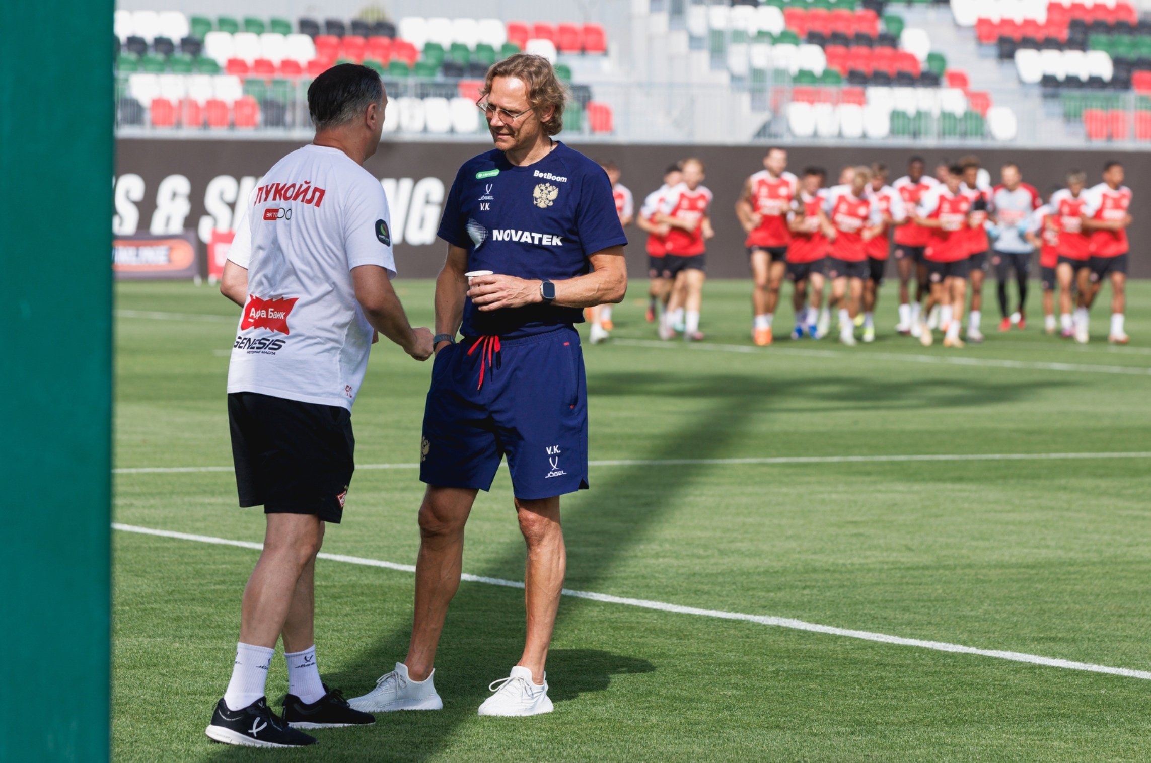 Главный тренер сборной России по футболу Валерий Карпин посетил открытую тренировку московского «Спартака», где пообщался с главным тренером Хуаном Карлосом Карседо и спортивным директором Франсисом Кахигао.