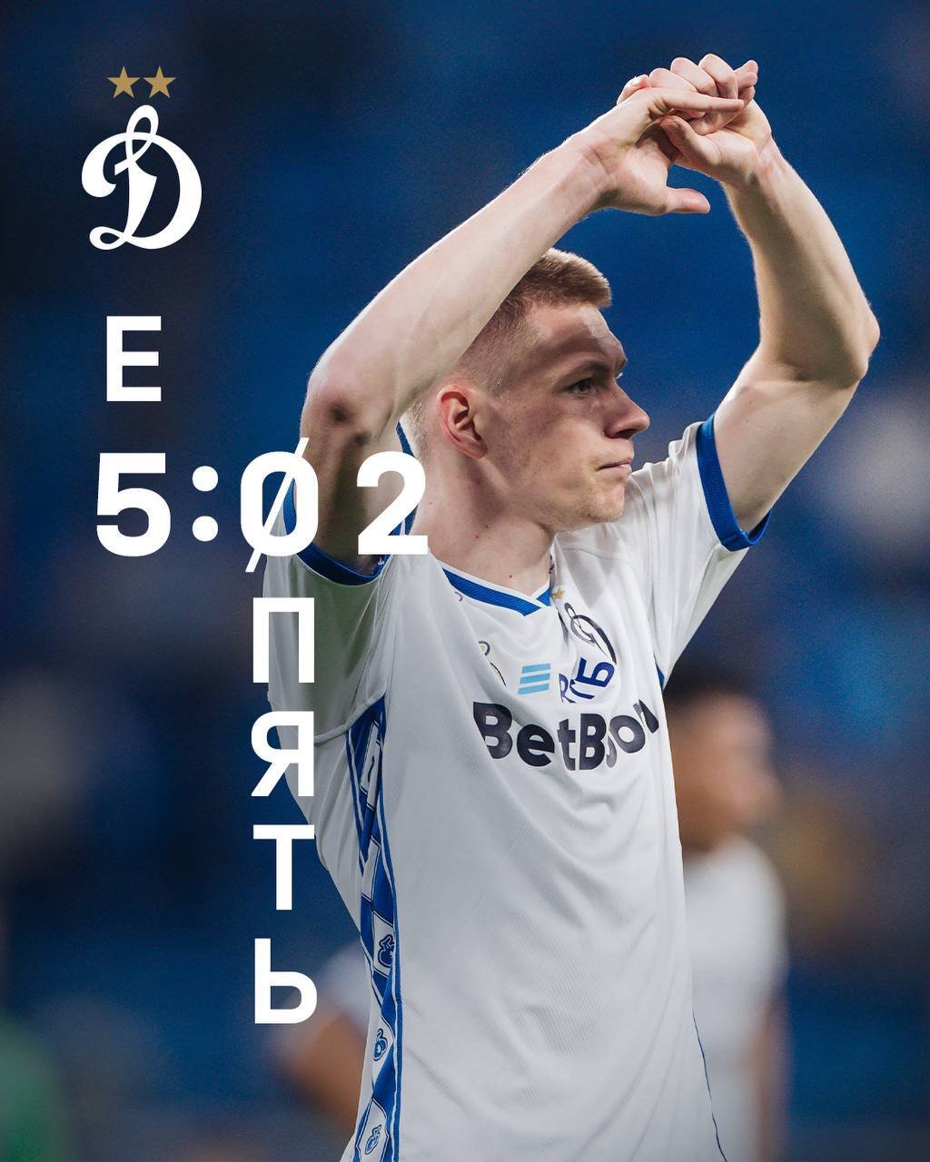 На изображении можно увидеть эмблему бело-голубых и счёт «5:2», в котором над цифрой 5 нарисована буква «Е», а цифра 2 стоит вместо перечёркнутого нуля, переходящего в слово «опять».