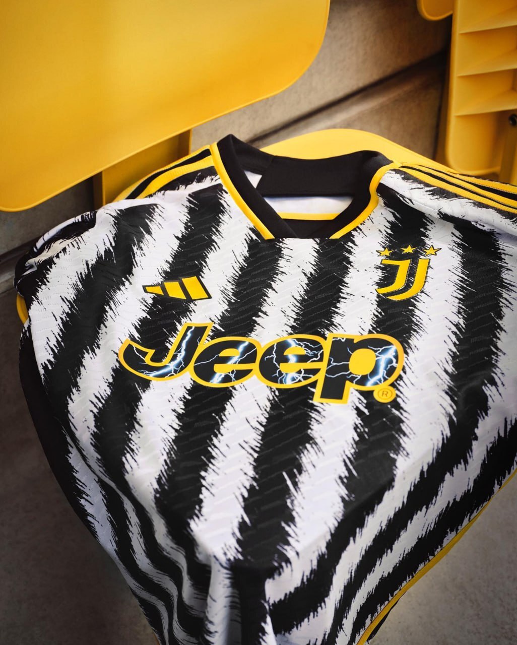 Новая домашняя экипировка «бьянконери» от компании adidas выполнена в традиционных чёрно-белых цветах в полоску со вставками жёлтого цвета.